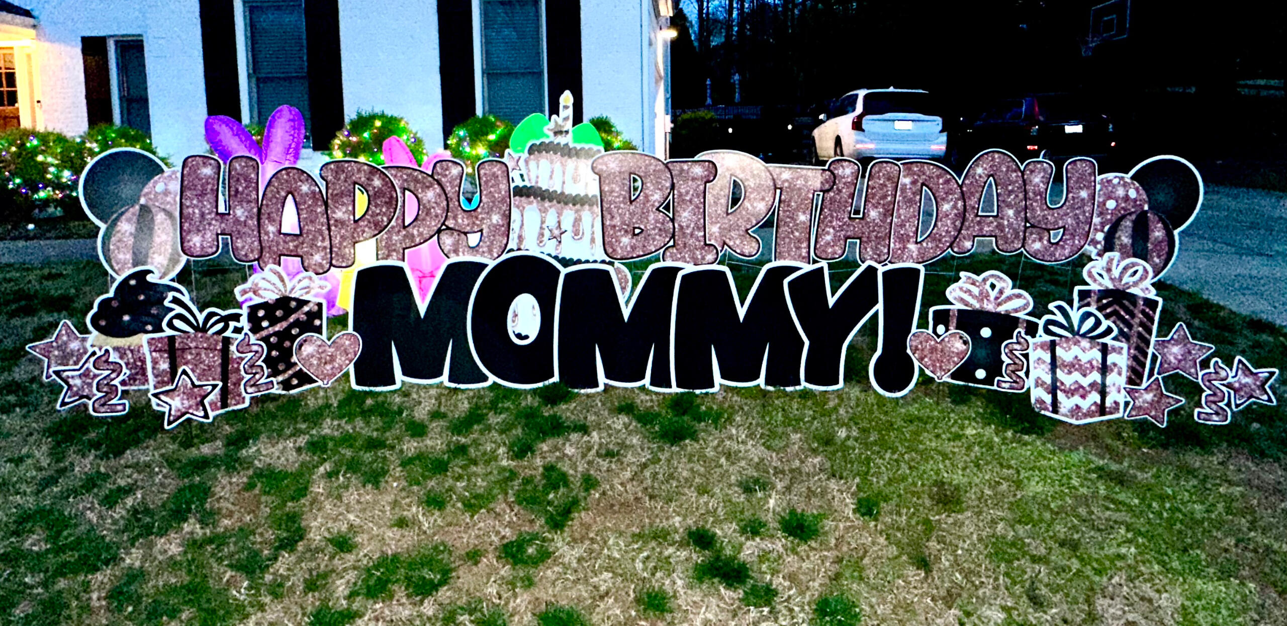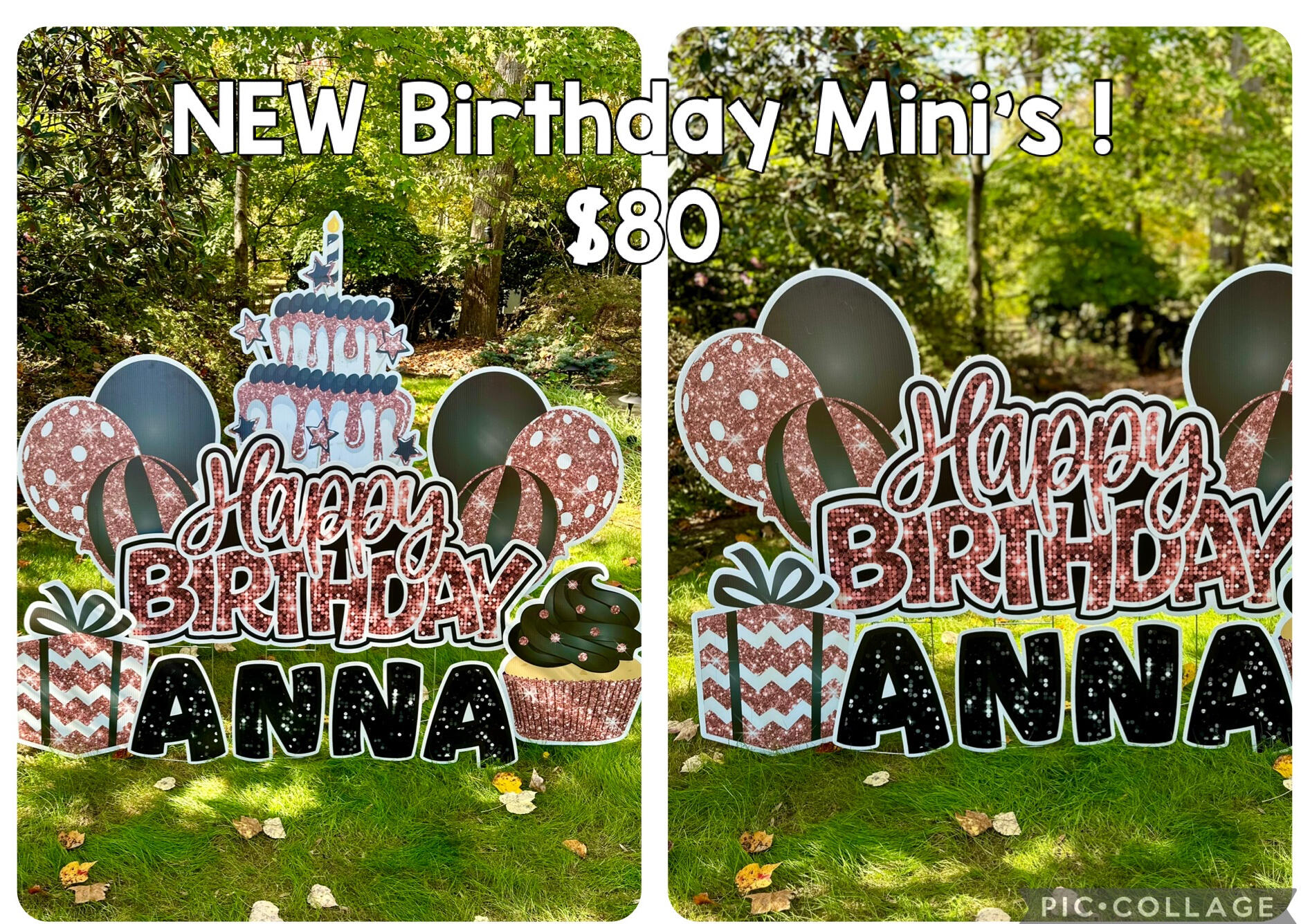 | Birthday Mini | $80 | 1. Small HB quickset sign | 2. Name | 3. 2 balloons/ balloon clusters | 4. 1 gift/cupcake on each side | (some have a cake & some do not) |